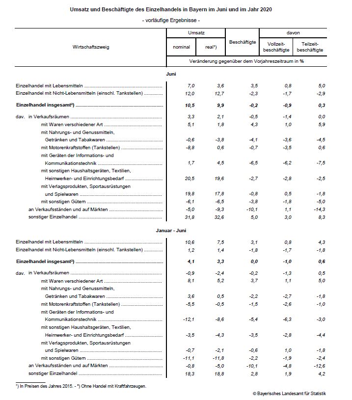 Wie das Bayerische Landesamt für Statistik nach den vorliegenden, ersten Ergebnissen der Monatsstatistik im Einzelhandel berichtet, stieg der Umsatz im bayerischen Einzelhandel (ohne Kraftfahrzeughandel) in den ersten sechs Monaten 2020 im Vergleich zum Vorjahreszeitraum nominal um 4,1 Prozent und preisbereinigt um 3,3 Prozent. Die Zahl der Beschäftigten blieb konstant. – Im Juni 2020 wuchs der Umsatz der Einzelhändler gegenüber dem Juni 2019 nominal um 10,5 Prozent und preisbereinigt um 9,9 Prozent; im Vergleich zum Mai 2020 ging der Umsatz jedoch um 2,8 Prozent zurück. Die Zahl der Beschäftigten nahm gegenüber dem Vorjahresmonat um 0,2 Prozent ab (Vormonat: +0,5 Prozent).
